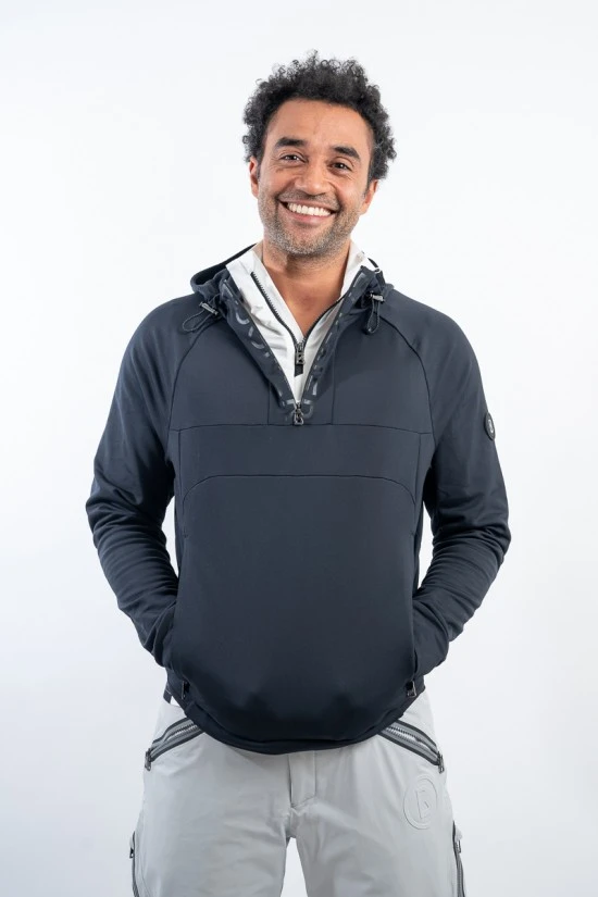 Carlito è il Softshell mezza zip di Bogner realizzato in tessuto tecnico elasticizzato con interno felpato. Pratico grazie alle due tasche a marsupio chiudibili da zip e al cappuccio fisso regolabile con coulisse. La zip principale a filo è inserita in una striscia di tessuto loggato tono su tono. Nelle giornate più fredde può essere indossato anche sotto la giacca da sci.