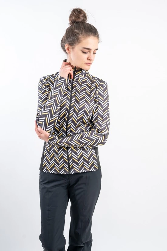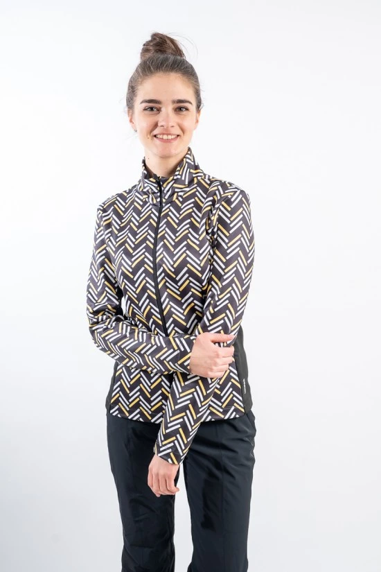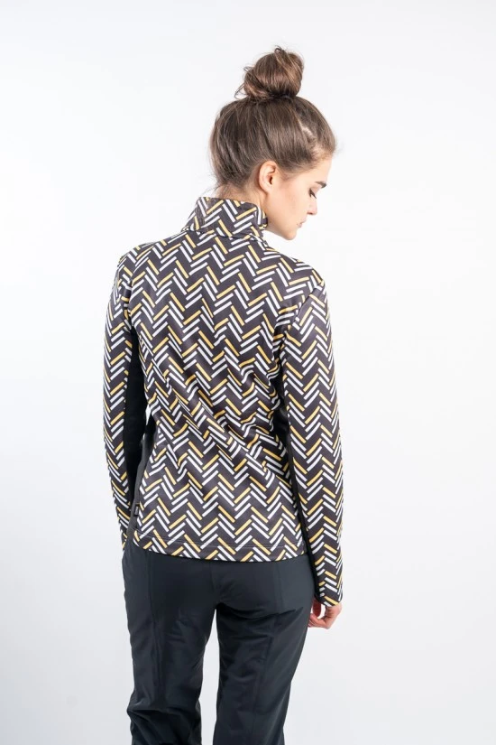 Sottotuta full zip in tessuto elasticizzato e felpato con stampa geometrica. Arricchito da due pratiche tasche laterali con chiusura zip a filo. Caldo e traspirante è ideale sotto la giacca da sci.