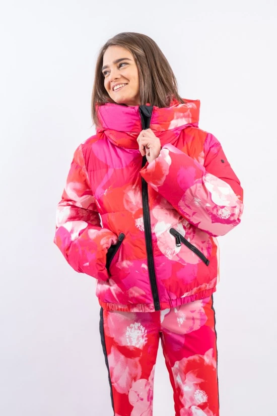 Alpenrose jacket, il piumino corto con cappuccio effetto bomber di Goldbergh. Caratterizzato da una vestibilità mid-over e dalla stampa allover. Particolarmente caldo e confortevole grazie all’imbottitura in piumino che lo rende perfetto anche con le temperature più fredde. Un capo unico e di grande effetto ideale dalla città alla montagna. Arricchito dalle fascie laterali multicolor, è dotato di zip metalliche e dai tirazip personalizzati.