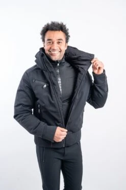 Giacca sci con cappuccio staccabile e regolabile con coulisse. Realizzata in tessuto 4-way stretch ad alte prestazioni con parte posteriore trapuntata. Leggera e calda, imbottita con morbide piume. Fascia sul fondo e polsini elasticizzati. La ghetta interna garantisce una tenuta ottimale.