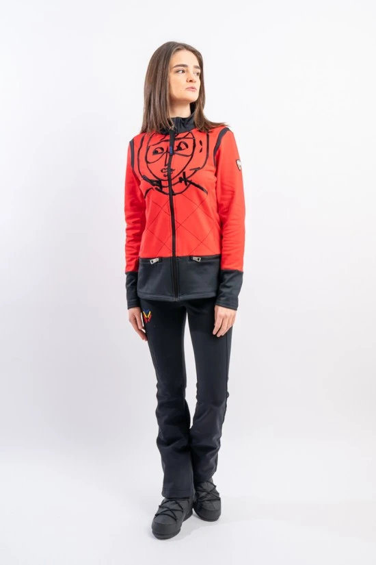 Celebrativo dei 20 anni di collaborazione con lo stilista Jean-Charles de Castelbajac, il sottotuta Climi ne rappresenta appieno la creatività. Il ricamo grafico abbinato alla particolare trapuntatura a rombi, è divertente e vivace. Full zip con collo in piedi. Confortevole e caldo è realizzato in tessuto elasticizzato felpato. Ideale sotto la giacca da sci o per praticare ogni sport all’aperto.