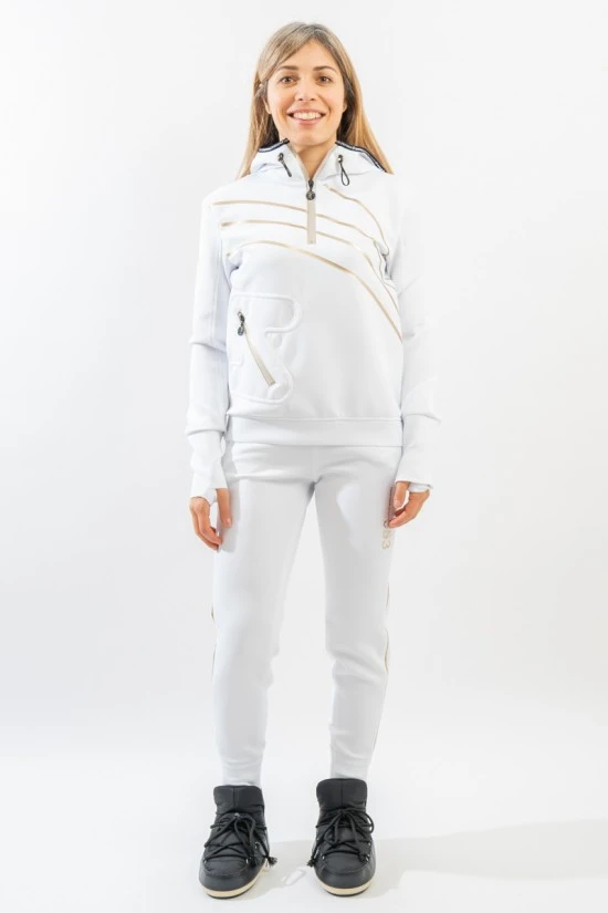 Sottotuta con cappuccio con apertura mezza zip gommata gold look firmato Sportalm. Realizzato in tessuto elasticizzato doppiato da una fodera tecnica. Caldo e traspirante. Arricchito dalle stampe e dal ricamo in tridimensione sul davanti. Confortevole ed altamente funzionale, è il complemento ideale per ogni tuo look sportivo in città e sulla neve.