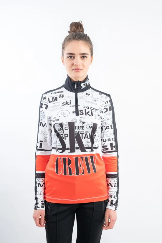Sottotuta mezza zip in tessuto elasticizzato felpato in stampa lettering. Arricchitto dalle cuciture esterne in filo silver e dal logo stampato metallizzato sul colletto. Caldo e traspirante è ideale sotto la giacca da sci.