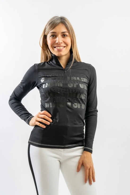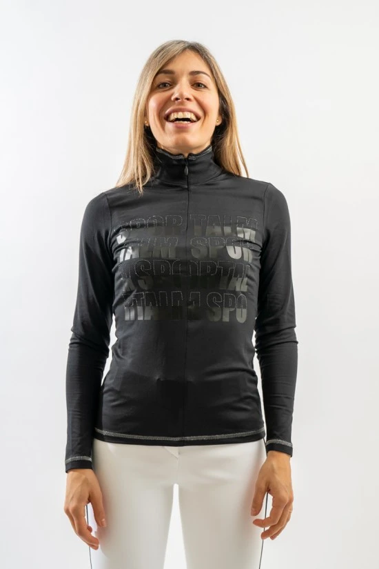 Sottotuta mezza zip in tessuto elasticizzato illuminato dalle cuciture a vista in filo silver. Caratterizzato dalle stampe lettering Sportalm arricchite da applicazioni strass tono su tono è elegante e d’effetto. Caldo e traspirante è ideale sotto la giacca da sci.