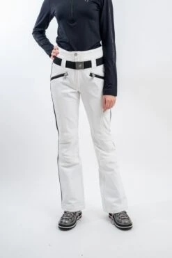 Pantalone sci a vita alta con cintura e banda laterale in contrasto dal gusto retrò. Realizzato in tessuto operato con microcostina diagonale. Comfort e vestibilità attimali. Ginocchio preformato e ghetta interna antineve sul fondo. Vestibilità regolare.